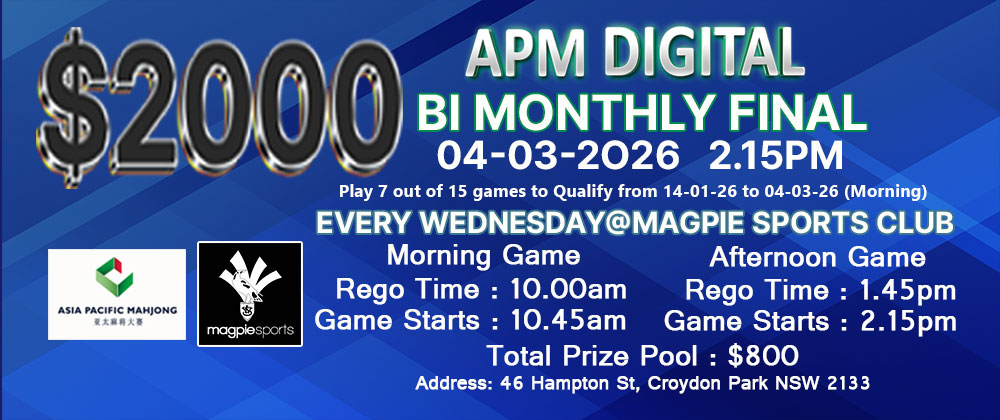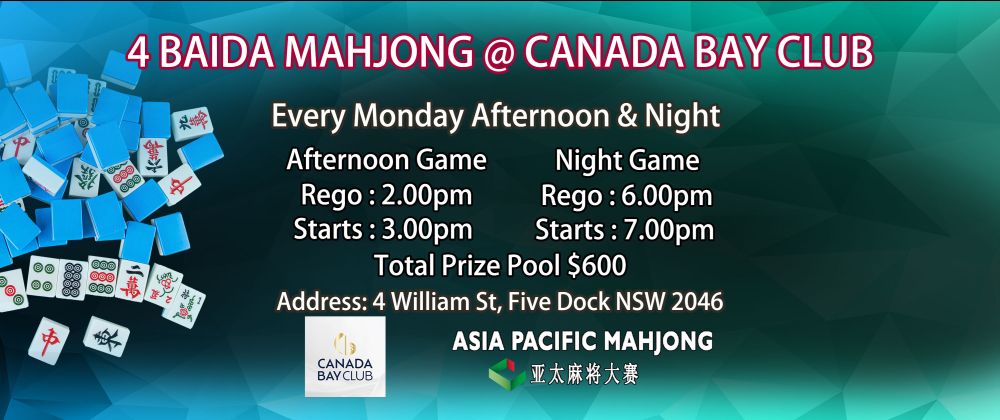 Please also note that the afternoon and night games on 2 September will be held at Ashfield RSL – 4 Baida Mahjong – Total Prize Pool: $1000