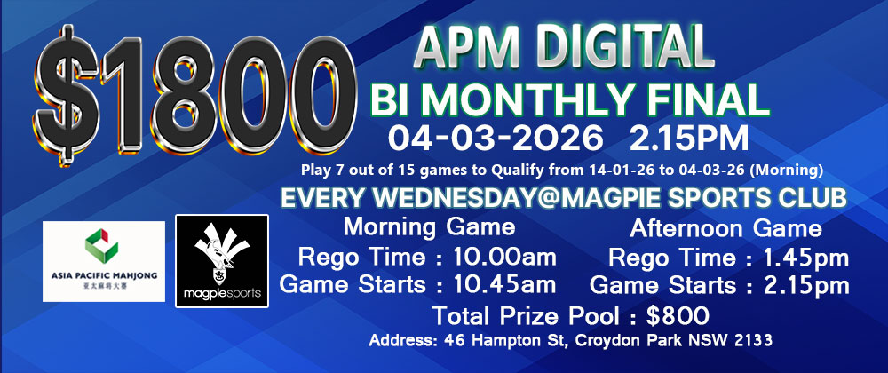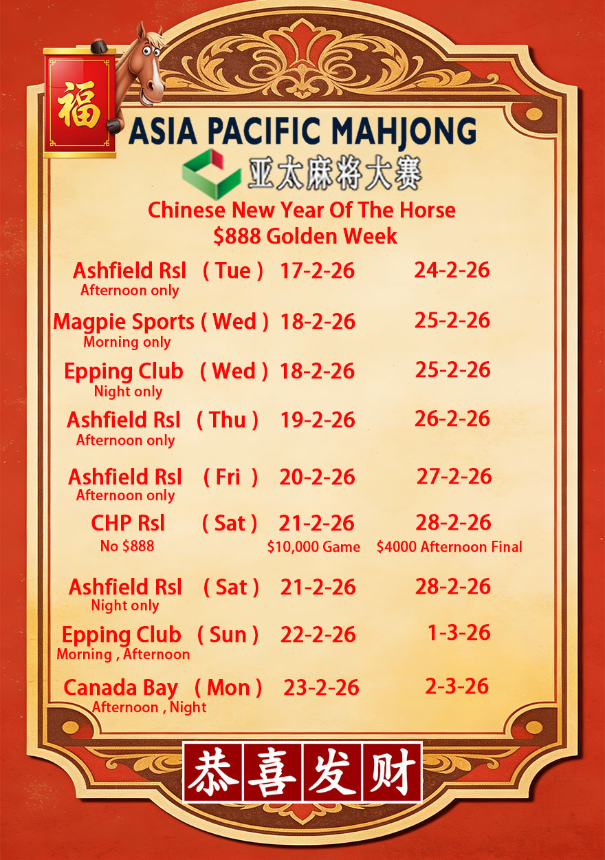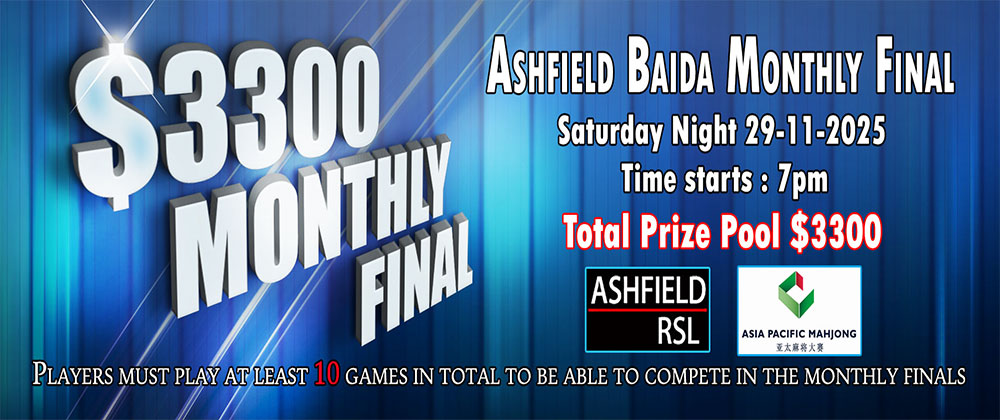 Please also note that the afternoon and night games on 2 September will be held at Ashfield RSL – 4 Baida Mahjong – Total Prize Pool: $1000