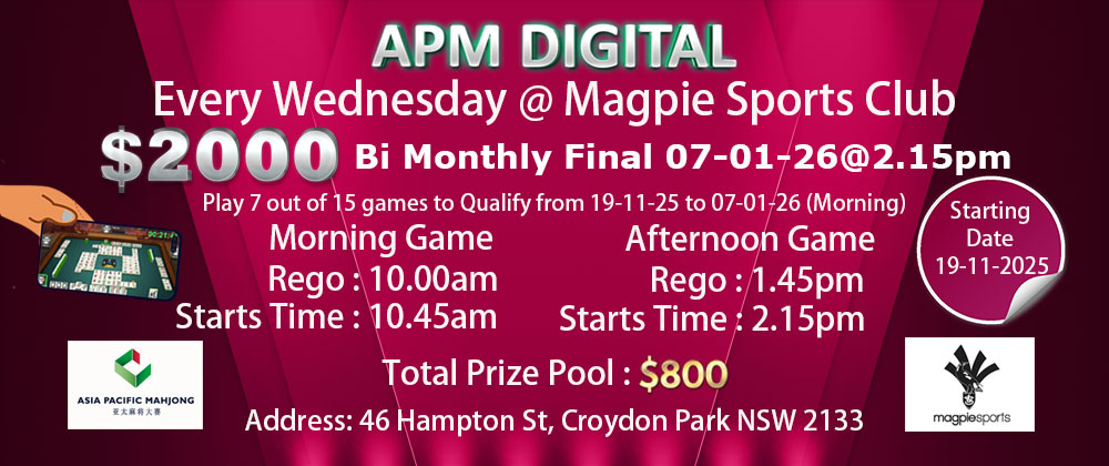 Please also note that the afternoon and night games on 2 September will be held at Ashfield RSL – 4 Baida Mahjong – Total Prize Pool: $1000